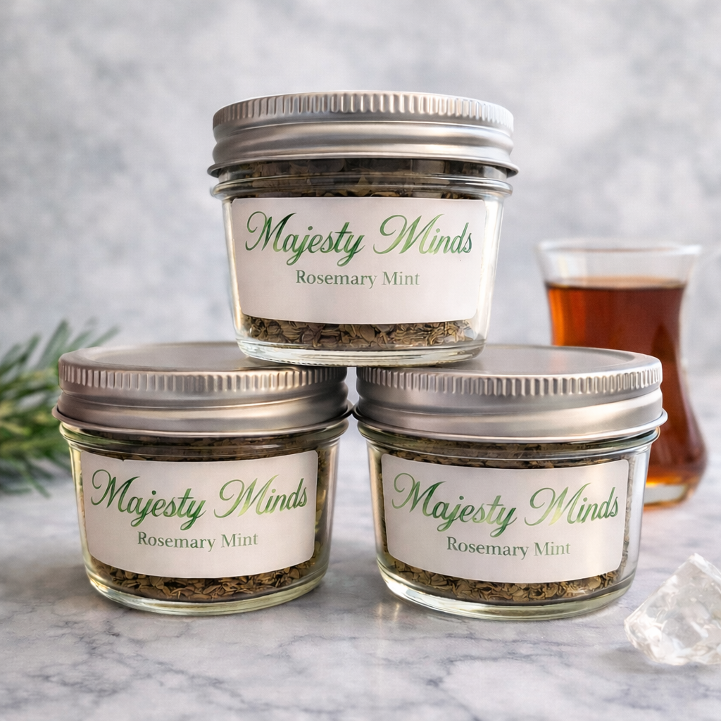 A refreshing herbal blend designed to awaken the mind and soothe the body. This signature Rosemary Mint infusion combines cooling peppermint with grounding rosemary for a smooth, revitalizing experience.